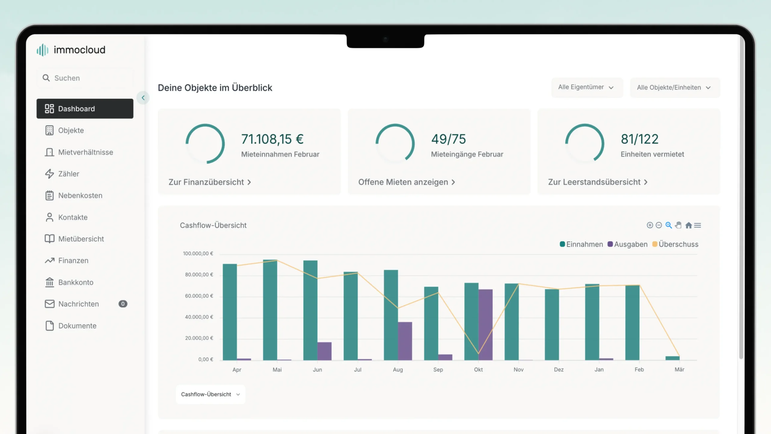 - Individuelles Dashboard – Übersicht über Cashflow, Rendite, Leerstandsquote etc.